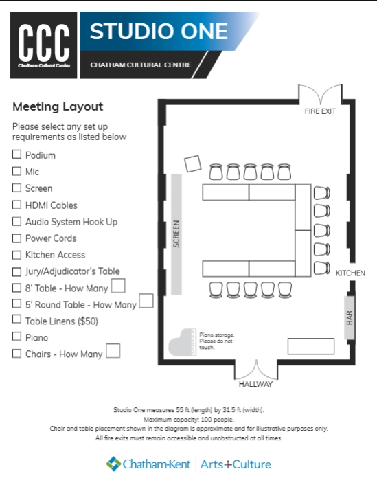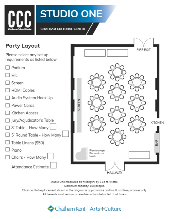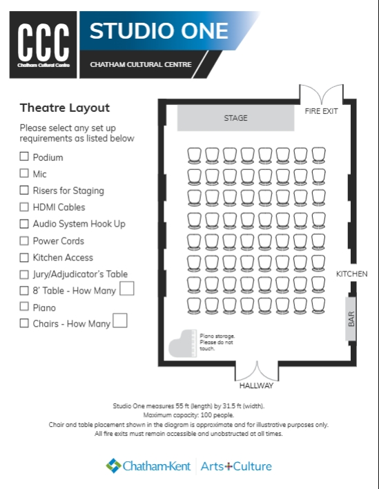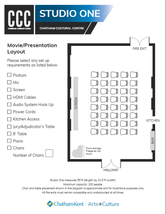 Studio One at the Chatham Cultural Centre is a versatile space with a creative, inviting atmosphere. Featuring exposed brick walls, it’s a popular spot for receptions, small weddings, birthdays, showers, meetings, performances, marketplaces, lectures, films, and more. The room comes with a projector, sound system, and is fully licensed with bar service available upon request. It can accommodate up to 100 guests, though availability may be limited due to the Kiwanis Theatre’s schedule.